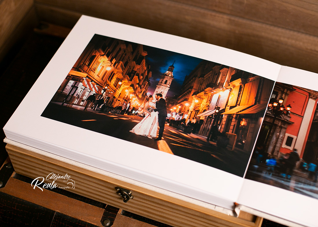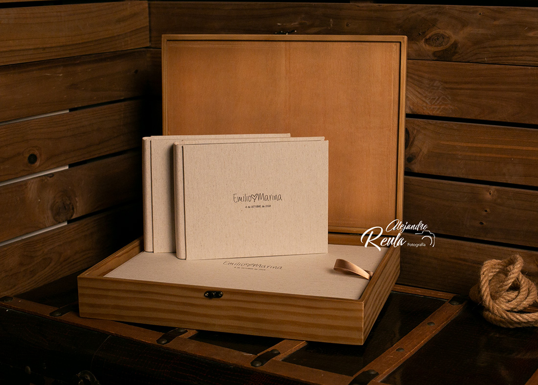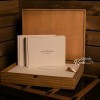 Este trabajo refleja el carácter general de nuestros trabajos en Bodas, álbum terminado en lino, con el logotipo de los novios personalizado, grabado a láser en la portada y entregado en un cofre de madera, en tono café. Como complemento, los dos álbumes “de padres”, réplicas exactas del álbum de los novios, un detalle perfecto para tener con los padres.
