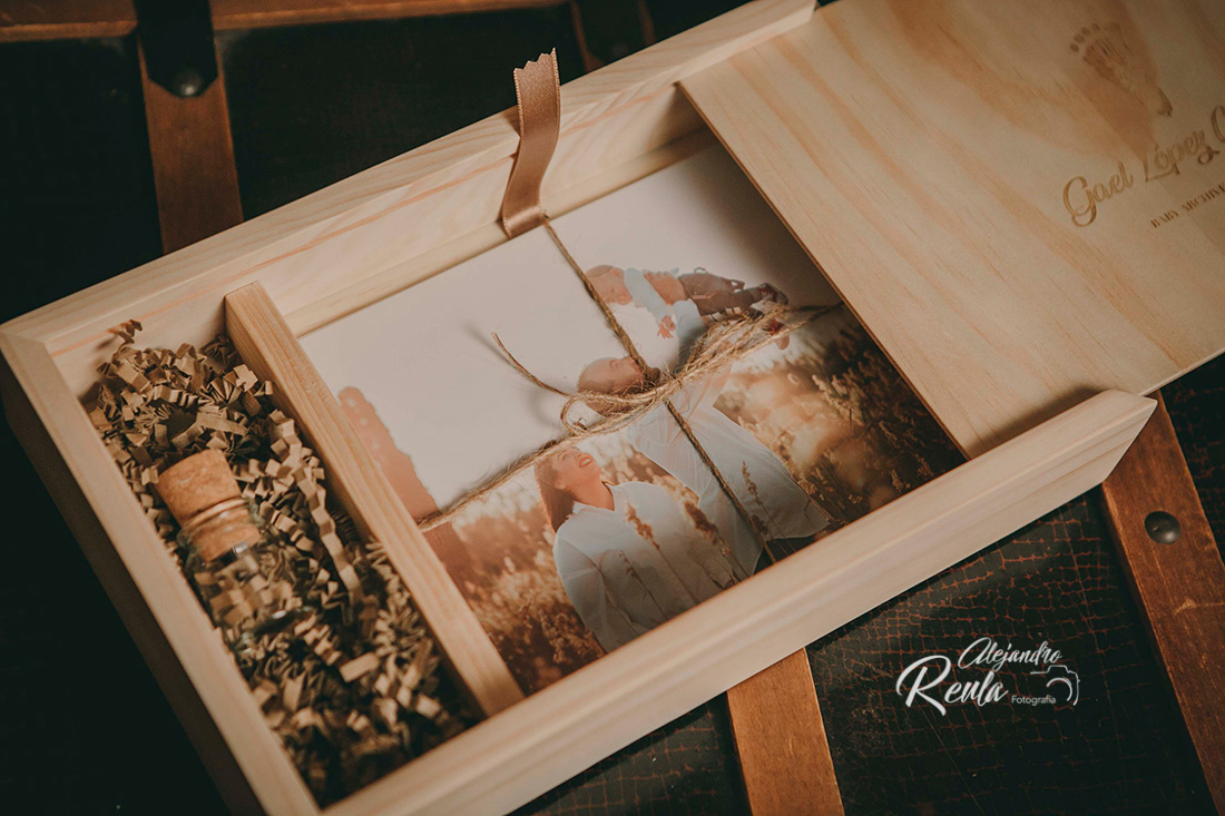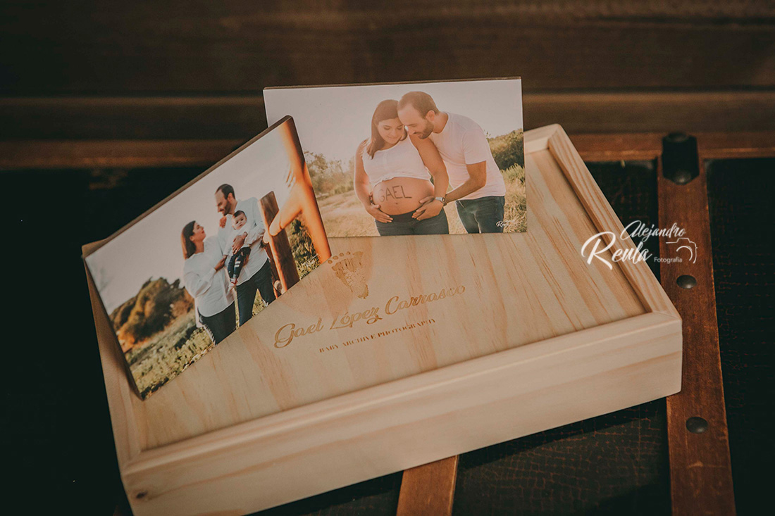 En este caso, hemos realizado dos reportajes de fotos, los últimos días de embarazo y los primeros meses de Gael, este es nuestro pack para embarazadas, entregamos esta caja de madera con 10 ampliaciones 15×20 y dos fotos 15×10 con peana y lo más importante, todos los archivos seleccionados y retocados en el USB, un producto que tiene muchísimo éxito entre nuestros clientes.